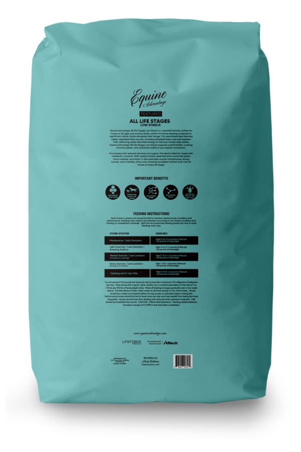 A textured feed that is designed for horses that require moderate to significant calories in addition to their forage. Fortified with Grand Meadows supplement for the overall health and immune system of your horse. Made with calm digestible energy that comes from high-quality fiber and fat sources. Low Starch Omega Plus is low in non-structured carbohydrates (NSC) and may be suitable for horses with insulin resistance, Cushing’s Disease, prone to tying up, Polysaccharide Storage Myopathy (PSSM), obesity, and Equine Metabolic Syndrome (EMS). The PLUS is added sources of Omega-3 and Omega-6 fatty acids, along with higher levels of both biotin and lysine.