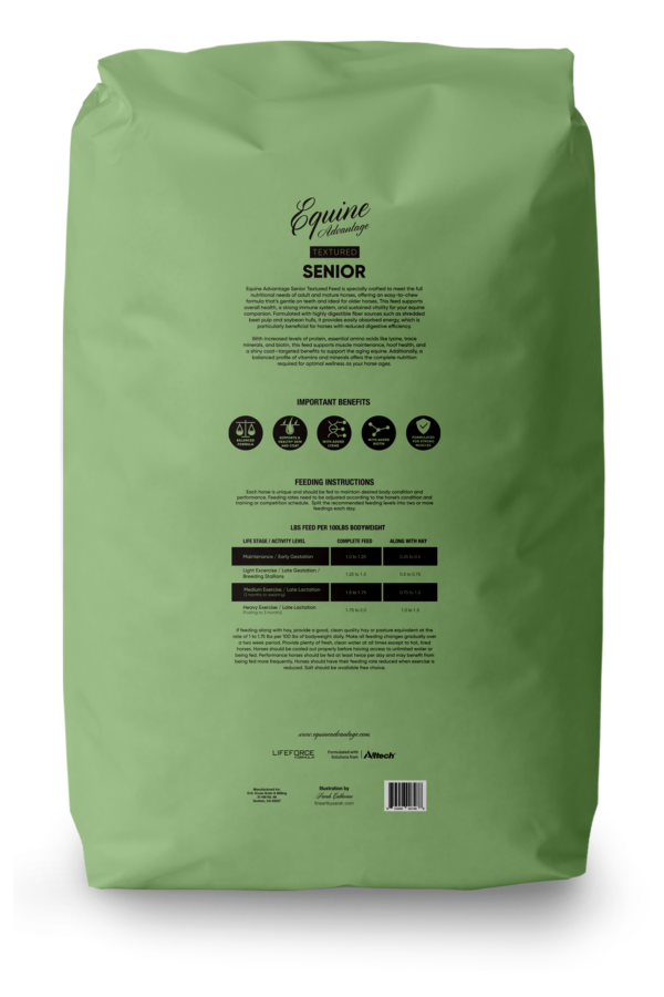 A textured feed that is designed for all of the nutritional needs of adult and mature horses that is easy to chew. Fortified with Grand Meadows supplement for the overall health and immune system of your horse. Formulated with highly digestible fiber sources-such as shredded beet pulp & soy bean hulls. Senior offers increased protein, amino acids, trace minerals, biotin, Lysine and vitamin fortifications that older horses with reduced digestive efficiency may benefit from.